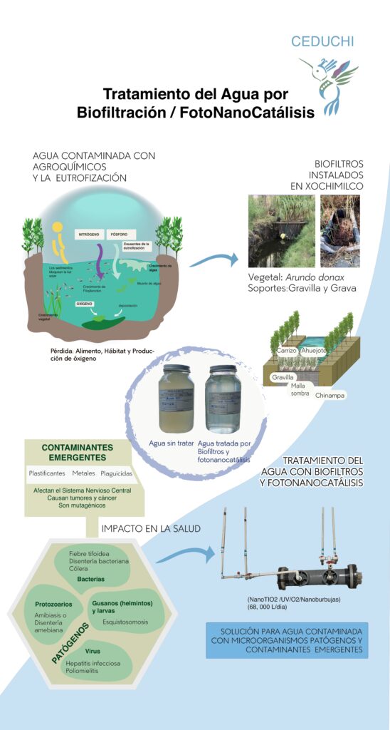 La mejora de la calidad del agua es un paso fundamental para la restauración de ecosistemas acuáticos y sistemas agrícolas. En Ceduchi implementamos tecnologías de biofiltración y fotonanocatálisis como estrategias sustentables para reducir contaminantes orgánicos, patógenos y compuestos persistentes presentes en cuerpos de agua urbanos y zonas agrícolas.